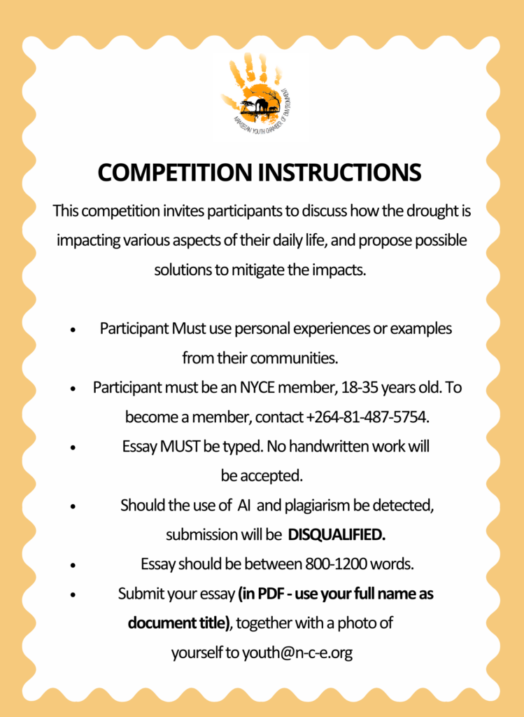 The Namibian Youth Chamber of Environment (NYCE) is hosting a November Essay Competition on the Impact of Namibia’s drought on livelihoods and the environment.